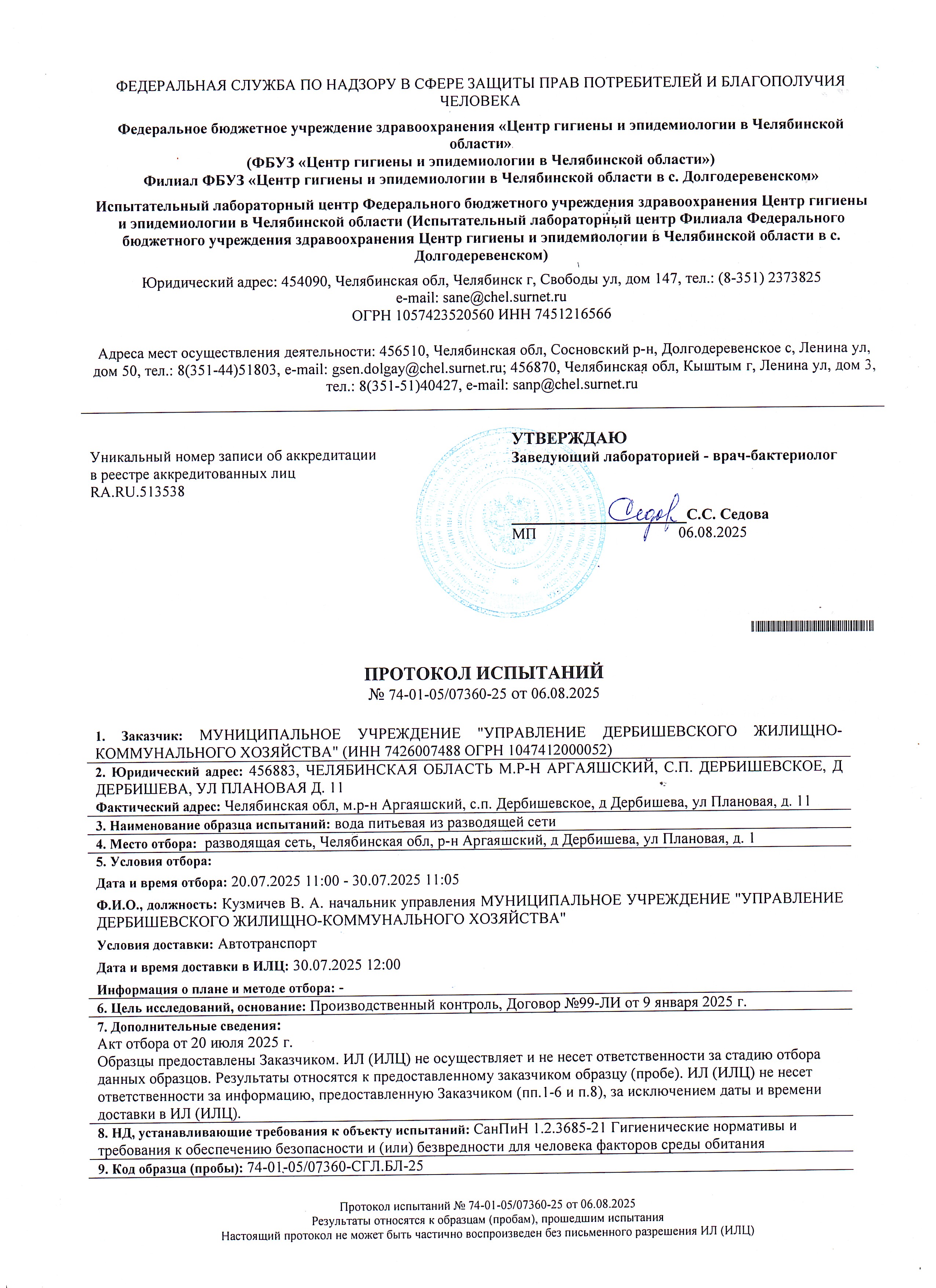 Протокол испытаний №74-01-05/07360-25 от 06.08.2025