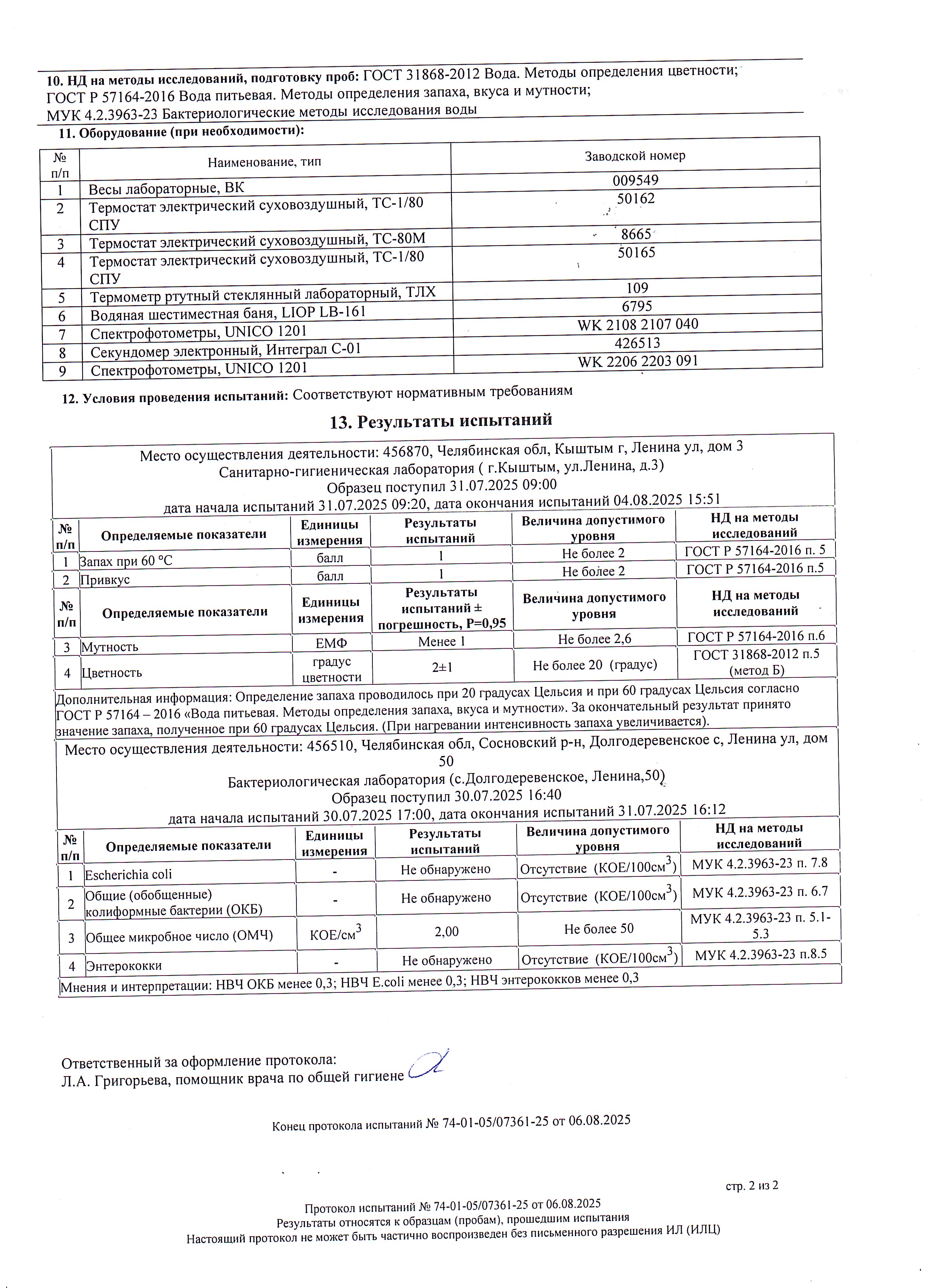 Протокол испытаний №74-01-05/07361-25 от 06.08.2025